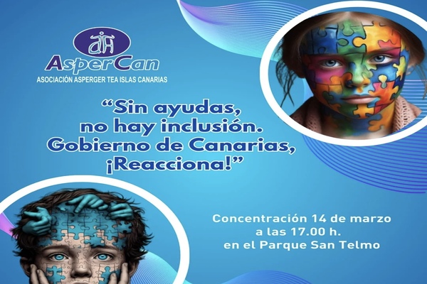 La Asociación de Personas con Trastorno del Espectro Autista de Canarias (AsperCan) convoca el viernes 14 de marzo una concentración simultánea en tres islas para reclamar al Gobierno de Canarias, con el lema Sin ayudas no hay inclusión. Gobierno de Canarias ‘Reacciona’, un derecho fundamental: los recursos y apoyos necesarios para garantizar la inclusión de las personas con TEA y sus familias.