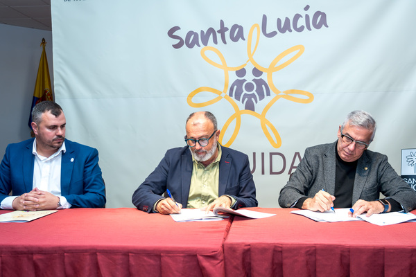 Analizar los principales retos sociales del municipio e impulsar las políticas de cuidados y bienestar de la ciudadanía son los principales retos del Observatorio de Innovación Social y Comunitaria que pone en marcha el Ayuntamiento de Santa Lucía de Tirajana con la colaboración de la Universidad de Las Palmas de Gran Canaria. El alcalde, Francisco García y el rector de la ULPGC, Lluís Serra, firmaron este miércoles el convenio de colaboración que permite poner en marcha el nuevo observatorio. En el acto también estuvieron el concejal de Atención Social y Comunitaria, Saúl Goyes, el personal municipal del área de Servicios Sociales, de otros departamentos y representantes de diferentes organizaciones sociales.