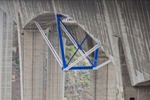 Todas estas tareas forman parte de las obras de emergencia para reforzar la estructura del Viaducto integrado en la Circunvalación de Las Palmas de Gran Canaria (GC-3), que ejecuta el Cabildo con una inversión cercana a los 11 millones de euros a través de la empresa especializada Freyssinet. Esta obra vivió un momento destacado el verano pasado con la colocación de un puntal de 25 toneladas de acero bajo el puente del lado tierra (dirección sur), el más afectado por la rotura de los tendones de acero con los que se construyó hace 20 años. Desde entonces hasta ahora se han estado instalando los últimos cuatro tendones de cables de acero que atraviesan el interior de este puente hasta salir al exterior en el vano central para apoyarse en esa pieza de acero y conformar así un refuerzo extradosado con una fuerza ascensional permanente de 574 toneladas sobre el tablero por el que circula el tráfico en dirección al sur de Gran Canaria.