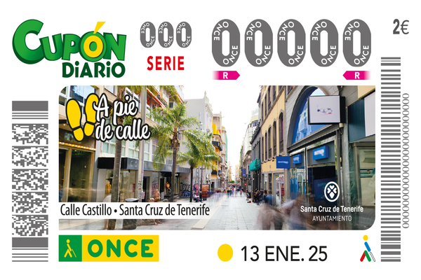 La calle Castillo, una de las vías comerciales más importantes de Santa Cruz de Tenerife, será la imagen del Cupón Diario de la ONCE el próximo lunes, día 13 de enero, perteneciente a la serie “A pie de calle”, del que se han puesto a la venta cinco millones de cupones que llevarán su imagen por toda España.