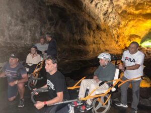 Por primera vez, en sus más de 50 años de historia, la emblemática Cueva de los Verdes ha acogido una ruta adaptada, permitiendo a personas con discapacidad física disfrutar de uno de los tesoros geológicos y artísticos más importantes de la isla. La acción pionera se ha materializado con la adaptación de sillas especiales Joëlette, que han permitido a Gerardo y Naiara recorrer un tramo significativo de la Cueva, sumergiéndose en un espacio que hasta ahora les estaba vetado.