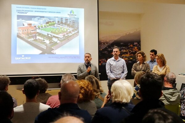 El alcalde de Santa Cruz, José Manuel Bermúdez, con las concejalas de Centro-Ifara y Deportes, Purificación Dávila y Alicia Cebrián, y el edil de Obras e Infraestructuras, Javier Rivero, presentaron a vecinas y vecinos de El Toscal el estudio de detalle de la actuación que se pretende ejecutar en el entorno de la Casa Pisa, “donde se prevé la dotación de unas 300 plazas de estacionamiento, además de una instalación deportiva cubierta, un espacio de ejercicio físico al aire libre, además de zonas de esparcimiento, teniendo en cuenta que todas estas dependencias y estancias son de uso público”, avanza el regidor.