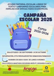 Desde la Concejalía de Servicios Sociales del Excmo. Ayuntamiento de Arucas son conscientes de las dificultades económicas de muchas familias del municipio y del gasto que supone el inicio de la etapa escolar.