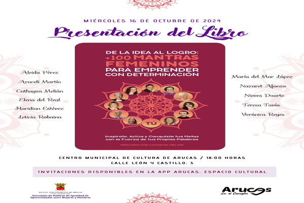 Desde de la Concejalía de Políticas de Igualdad de Oportunidades entre Mujeres y Hombres del Excmo. Ayuntamiento de Arucas, a lo largo del mes de octubre del presente año se llevarán a cabo distintos acciones enmarcadas en un Programa de Actos titulado Arte en Femenino.