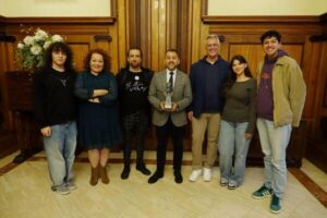 El alcalde de Santa Cruz, José Manuel Bermúdez, y el concejal de Cultura, Santiago Díaz Mejías, recibieron este miércoles a los galardonados de la primera edición de los Premios Teatro Joven Ángel Guimerá y Jorge en el marco del centenario del fallecimiento del dramaturgo chicharrero. Unos premios que rinden homenaje a su figura y su legado, que fomentan la actividad escénica en la ciudad, y cuya gala se celebró el pasado sábado 25 de enero en el teatro capitalino.
