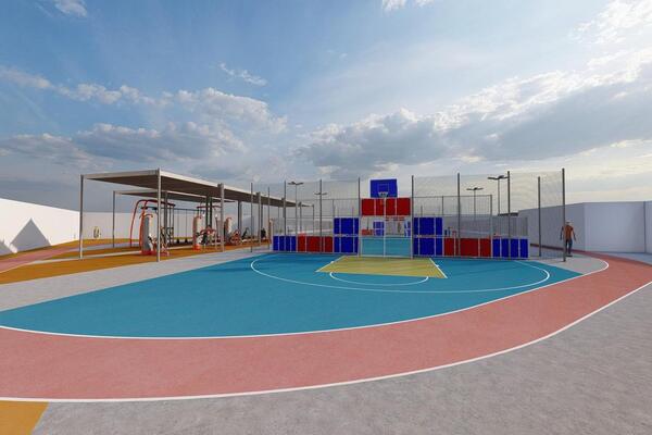 Además, este espacio tendrá una pista multideporte de 26 x 15 metros, dotada con dos porterías de fútbol en los extremos cortos, dos canastas dobles de baloncesto sobre las porterías, dos de ellas encaradas al interior y dos al exterior de la pista, y cuatro miniporterías en los lados largos.