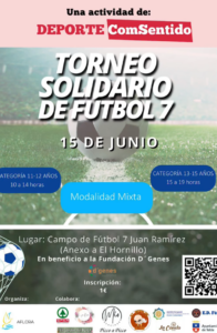 La Asociación Aflora organiza en modalidad mixta el Torneo Solidario de Fútbol 7 en beneficio de la Fundación D’Genes. Una iniciativa que se celebrará el sábado 15 de junio en el Campo de Fútbol 7 Juan Ramírez, ubicado junto a El Hornillo. La inscripción para participar es de un euro y contará con la categoría de 11 a 12 años, quienes jugarán de 10:00 a 14:00 horas. Mientras que de 13 a 15 años harán lo propio de 15:00 a 19:00.