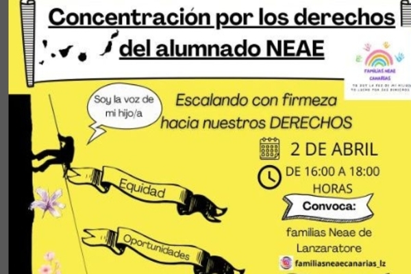 El 2 de abril, de 16:00 a 18:00 horas, tendrá lugar una concentración frente al Cabildo de Lanzarote con el objetivo de reclamar una educación inclusiva, mayores recursos para el alumnado con necesidades específicas de apoyo educativo (NEAE) y el cumplimiento de sus derechos.