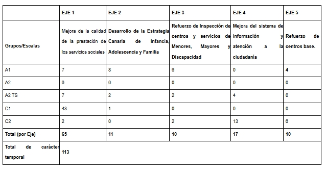En total se prevé la contratación temporal de 113 personas que permitirán mejorar la prestación de los servicios sociales, el desarrollo de la Estrategia canaria de Infancia, Adolescencia y Familia, el refuerzo de Inspección de centros y servicios de Menores, Mayores y Discapacidad, la mejora del sistema de información y atención a la ciudadanía, y el refuerzo de centros base. Este refuerzo de personal supondrá una inversión total de 14.314.483,96 euros.