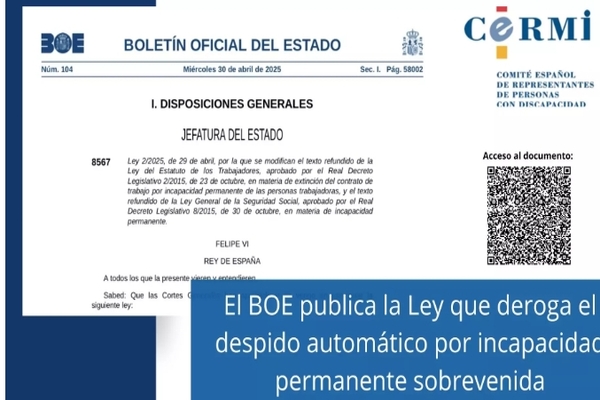 El Boletín Oficial del Estado (BOE) publica la Ley 2/2025, de 29 de abril, que modifica a su vez el Estatuto de los Trabajadores y la Ley General de Seguridad Social en virtud de la cual se deroga el despido automático por razón de incapacidad laboral permanente, desterrando así del ordenamiento jurídico español una discriminación histórica para los trabajadores con discapacidad sobrevenida.