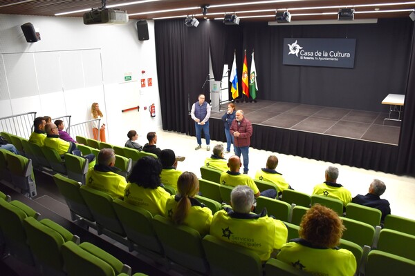 El alcalde de El Rosario, Escolástico Gil, acompañado de la primera teniente de alcalde, Fátima Gutiérrez, y del concejal de Empleo y Desarrollo Local, Yeray Gutiérrez, recibieron en la mañana de hoy, lunes, en la Casa de la Cultura, a los 24 trabajadores y trabajadoras correspondientes al segundo grupo del citado plan de empleo.