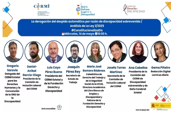 El próximo martes 14 de mayo, el CERMI, a través de su Red de Defensa Legal de la Discapacidad, y la Fundación Derecho y Discapacidad (FDyD) celebrarán el seminario “La derogación del despido automático por razón de discapacidad sobrevenida. Análisis de la Ley 2/2025”, un espacio de reflexión jurídica y social sobre el impacto de esta relevante reforma normativa