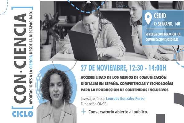 El Centro Español de Documentación e Investigación sobre Discapacidad (CEDID), acoge el próximo miércoles, 27 de noviembre, a las 12:30h la presentación de la tesis de Lourdes González Perea: ‘Accesibilidad de los medios de comunicación digitales en España. Competencias y tecnologías para la producción de contenidos inclusivos’, y un conversatorio posterior con el público.