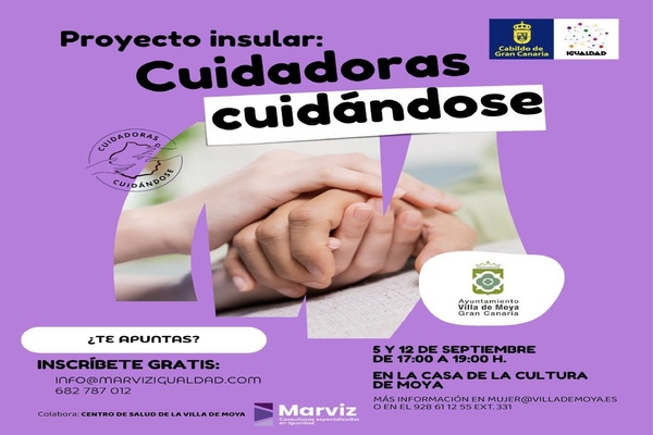Los días 5 y 12 de septiembre, de 17:00 a 19:00 horas, se celebrará en la Casa de la Cultura de Moya el proyecto insular ‘Cuidadoras cuidándose’. Una iniciativa diseñada para apoyar y fortalecer a las personas cuidadoras no profesionales ofreciendo herramientas y recursos que promuevan el bienestar y la salud integral de las cuidadoras.