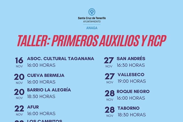 El Ayuntamiento de Santa Cruz de Tenerife, a través de la oficina del distrito Anaga que dirige la concejala Gladis de León, impartirá una serie de talleres de primeros auxilios sanitarios y Reanimación Cardiopulmonar Básica (RCP) a lo largo del mes de noviembre, y que van dirigidos a los vecinos y vecinas de los núcleos poblacionales de Anaga.