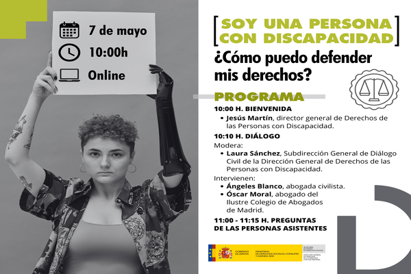 La Dirección General de Derechos de las Personas con Discapacidad del Ministerio de Derechos Sociales, Consumo y Agenda 2030, te invita al diálogo ‘Soy una persona con discapacidad, ¿cómo puedo defender mis derechos?’, un evento online en el que dos abogados con discapacidad nos van a explicar de manera sencilla y clara cómo tenemos que actuar ante una discriminación.