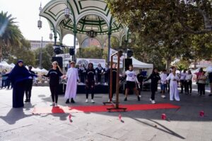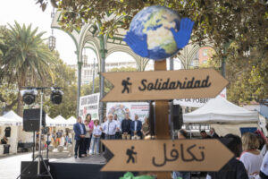 En medio del parque San Telmo una lona reja, y en el centro un marco como si fuera un espejo, alumnos y alumnas caminan sobre la lona al ritmo de una canción que habla de los caminos. Van saliendo estudiantes al escenario con diferentes carteles donde ponen lemas como: ‘Los caminos de la solidaridad se encuentran’, ‘La solidaridad es el camino’, ‘Escribimos nuestros caminos mientras somos solidarios’, ‘Si hay solidaridad habrá paz en nuestro mundo’…Junto a uno de los carteles se levanta la bandera Palestina, país al que está dedicado el Encuentro Gran Canaria Solidaria este año.