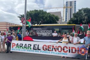 “Nosotros, con todos los recursos disponibles, no vamos a parar de denunciar este genocidio y estos crímenes de guerra, que estamos viendo todos los días a través de los medios de comunicación y que, lamentablemente, la comunidad internacional no quiere ver”, denunció Quevedo durante la presentación de la guagua, a la que acudieron medio centenar de ciudadanos que ofrecieron consignas de apoyo al pueblo palestino.