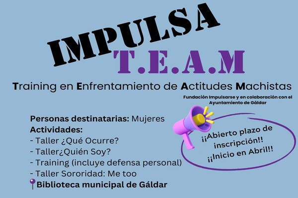 La Concejalía para la Igualdad entre Mujeres y Hombres, que dirige Ana Teresa Mendoza Jiménez, colabora en un programa que llega al municipio a partir de este mes de abril denominado Impulsa TEAM (Training en Enfrentamiento de Actitudes Machistas). Las inscripciones ya se encuentran abiertas y las actividades tendrán lugar en la Biblioteca Municipal de Gáldar.