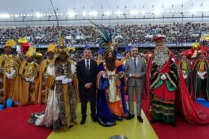 El alcalde, José Manuel Bermúdez, recibió a los Reyes Magos en el estadio Heliodoro Rodríguez López, donde les entregó la llave maestra de todas las casas de Santa Cruz en el marco del acto de a Sus Majestades, que llegaron en helicóptero a un estadio que los esperaba abarrotado de ilusión.