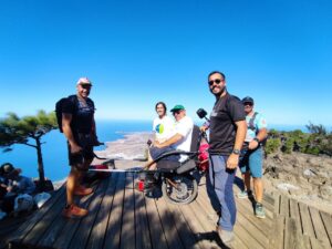 Tenemos otro proyecto que se llama ‘Senderismo Inclusivo’, financiado por el Cabildo de Gran Canaria y el Ayuntamiento de Arucas, donde hacemos senderismo desde una perspectiva inclusiva para que cualquier persona pueda participar. Hemos podido hacer un curso para todos nuestros técnicos en utilización de sillas Joëlette para que personas con movilidad reducida puedan apuntarse y disfrutar de la naturaleza. Ya hemos hecho 4 de los más de 8 senderos que vamos a realizar.