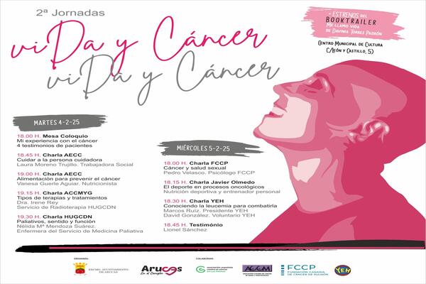 El Ayuntamiento de Arucas, en colaboración con la Asociación Canaria de Cáncer de Mama y Ginecológico, la Asociación Española contra el Cáncer, la Fundación Canaria de Cáncer de Pulmón y la Asociación Ya Era Hora, junto con la familia de Davinia Torres Padrón, vuelve a celebrar las segundas Jornadas “Vida y Cáncer”, con la finalidad de prevenir, informar, brindar apoyo, fomentar la solidaridad, la empatía y el acompañamiento en la lucha contra esta enfermedad.