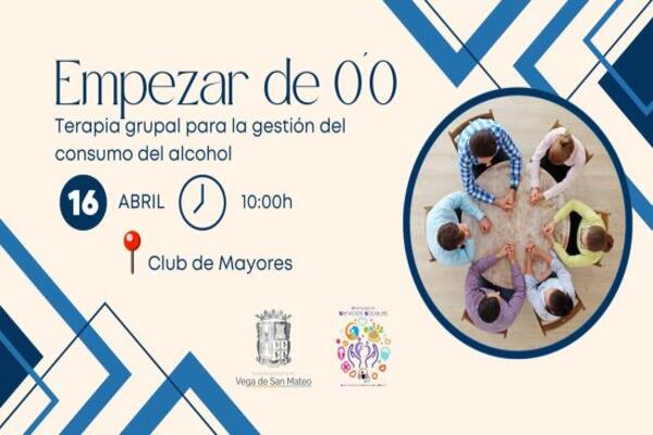 Como la actividad programada para el 16 de abril a las 10:00 horas en el Club de Mayores. El taller ‘Empezar de 0,0’ es una terapia grupal para la gestión del consumo de alcohol. Promoviendo un espacio seguro, cercano y guiado por un profesional, donde poder compartir, reflexionar y comenzar a cuidarse.
